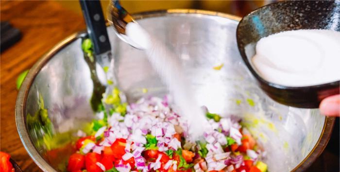 配料調味:西紅柿1個 新鮮辣椒20克 香菜碎5克 洋蔥碎20克 橄欖油30克 適量的鹽 少許白糖 檸檬汁水10克
