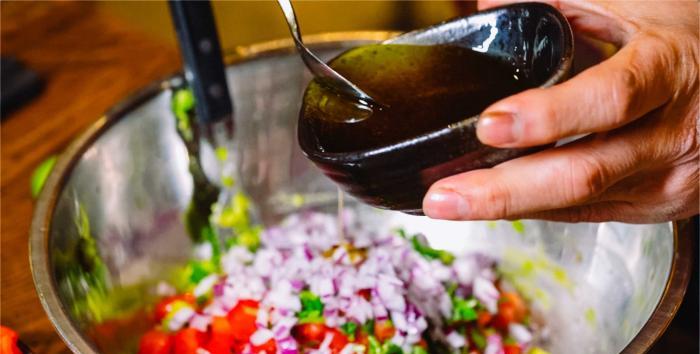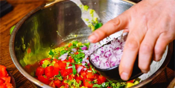 加入西紅柿丁,新鮮辣椒20克,香菜碎5克,洋蔥碎20克,橄欖油30克,主要就是豐富口味和原料的顏色和香味,