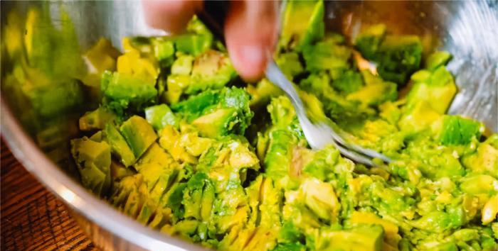 把將牛油果壓碎,量大我們可以攪拌一下,如果小的話我們就用勺子進行搗碎就可以,可以面一些的口感也很好。