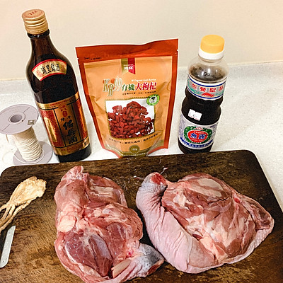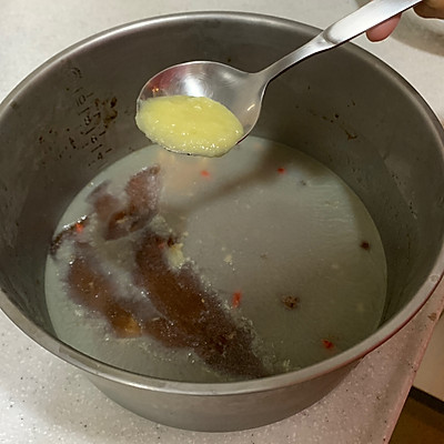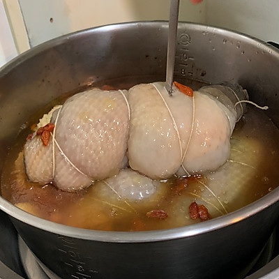 7 將冷藏的雞湯從冰箱取出後,用湯匙將浮在表面的雞油刮除。 之後倒入紹興酒一瓶、魚露一瓶,因為魚露已有鹹味,所以不用再加入任何鹽做調味。 之後將雞腿捲的麵線拆開(此時雞腿捲已定型),全部放置加入調味了的雞湯內進行醃製。 再放入冰箱內冷藏。