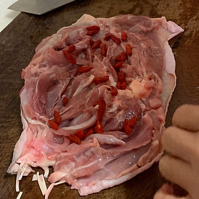 3 清洗好枸杞後將枸杞均勻分佈至雞腿排上。