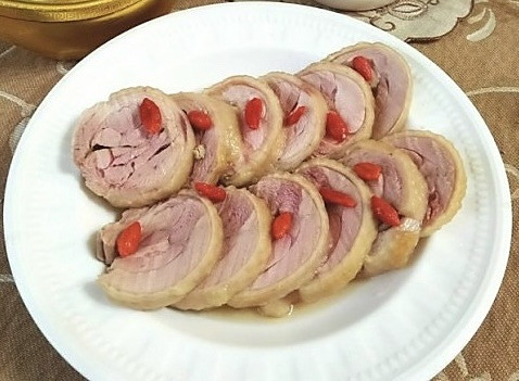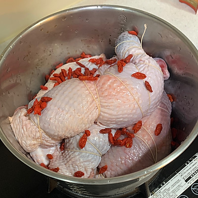 5 將捲好的雞腿排放置電鍋內,並加入適量的枸杞 鍋內加入160g飲用水 電鍋加入320g飲用水 進行蒸煮 差不多30分鐘後,當電鍋跳起後, 再持續悶煮約30-40分鐘,即可起鍋。