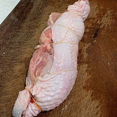 4 用棉線將雞腿排捲成肉卷。(盡量將雞皮理順,不影響美觀,雞腿捲也需要綁的緊實一點)