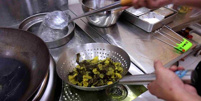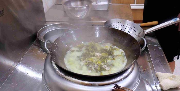 5.下面,我們把酸菜冷水放入鍋中焯一下水,去除上面的鹽分,否則吃的時候比較鹹,酸菜下鍋以後,煮2分鐘左右倒出來,用清水沖洗乾淨瀝乾水分備用。