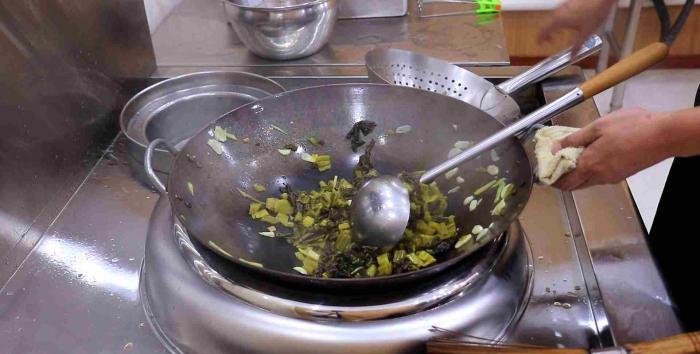 把鍋燒熱加入少許底油,放入野山椒、薑絲和蒜片一起翻炒,炒出蒜香味以後,把酸菜倒入鍋中煸炒2分鐘左右,炒出酸菜中的水分,這樣酸菜吃起來會更加清脆,酸菜炒幹炒香以後倒出來備用。