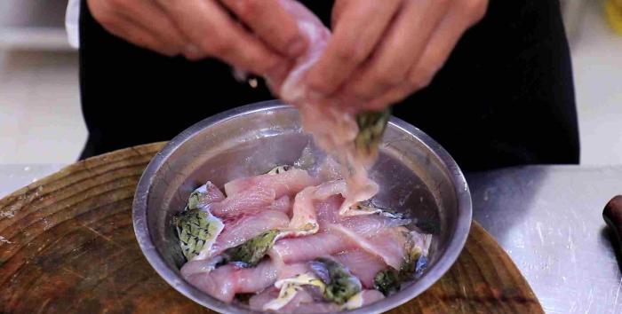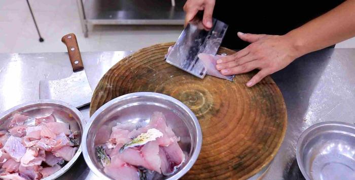 沿著魚的脊背,把兩邊的魚肉片下來,把魚骨剁成小塊,魚刺剔下來也剁成小塊,和魚骨放在一起,把魚肉斜刀片成均勻薄片備用。