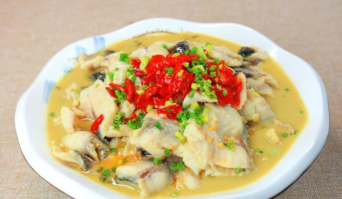 10分鐘以後把酸菜和魚骨撈出來,放在盤中墊底,然後把鍋中的湯汁燒開,把醃好的魚片依次放入鍋中,開小火滑煮30秒鐘,魚片定型變白以後即可起鍋,魚片不能煮太久,容易煮老口感不嫩滑,把魚片盛放在盤中,撒上紅泡椒和蔥花等待激油。
