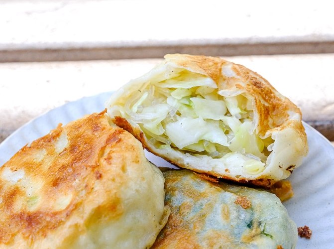 這攤的水煎包,是我願意為了它排隊的那種!尤其是剛起鍋的時候,那香氣... 外皮煎得金黃酥脆,咬下去會有「喀嚓」一聲。重點是內餡!滿滿的清甜高麗菜絲加上冬粉和一點點提味的絞肉,調味剛剛好,非常清爽。咬下去要小心,因為內餡飽含水份,真的會「爆汁」!記得第一次買沒經驗,就被燙到舌頭,但那個鮮甜滋味讓我甘願被燙。一個才銅板價,胃口小的女生,兩個就飽了。下午茶時段出沒,太晚去常常就賣光了。