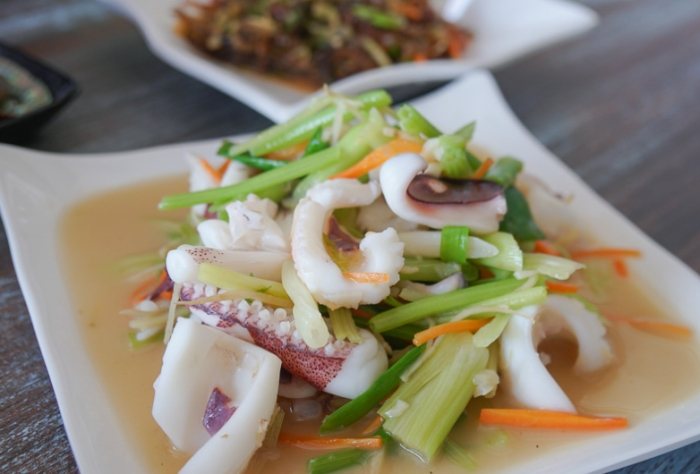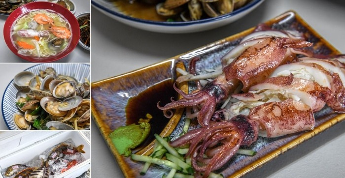 無選單,交給阿公配!常見的有清蒸活魚、生魚片、白灼蝦、小卷、海鮮羹、炸海鮮拼盤等,通常有8-10道,吃超飽!