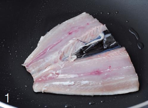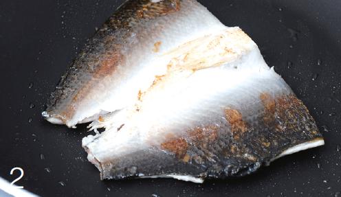 - 將有魚皮那一面放入油鍋中煎,煎至金黃色後再煎另一面,此時蓋上鍋蓋,以避免油爆。