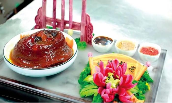 將豬蹄花烙毛刮洗乾淨,焯水後過涼,鍋內放入醬油,米酒,八角,姜蔥,蹄花煮至八成熟;撈出蹄花放入碗內,加入滷湯上籠蒸至肉質酥爛,將蹄花扣入盤內,旁邊擺上焯水菜心,將蒸肘子湯汁入鍋勾。