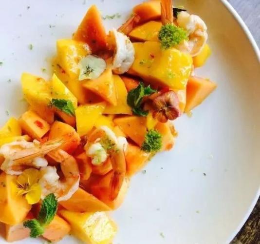 5只青蝦、150克象牙芒果、150克熟木瓜、5-6片薄荷葉、適量三色堇、適量青檸皮、150克泰式甜辣雞醬、10克礦泉水、5克美國辣椒仔、10克幼砂糖、半個青檸檬(汁)、3克青檸檬皮碎、少許魚露、3克鹽
