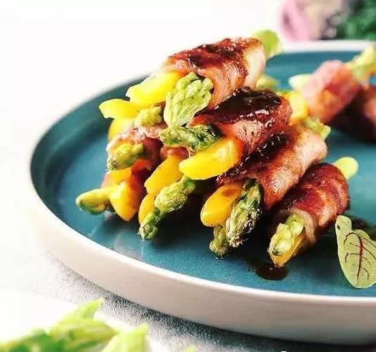 100克培根、50克蝦膠、150克蘆筍、150克黃彩椒、30克黑椒汁